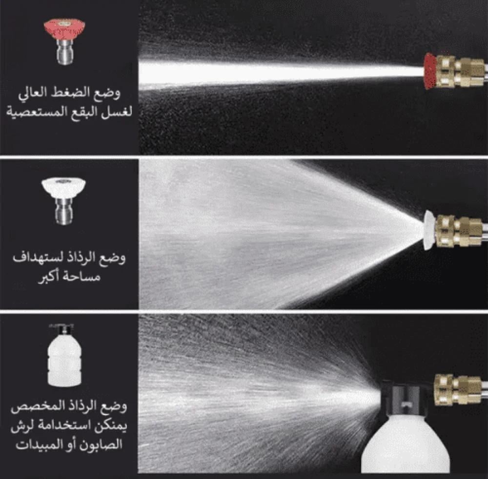 · ضخ الماء : تأتي بثلاث وضعيات مختلفة لتدفق الماء لتلبية جميع احتياجاتك. وضع الضغط العالي لغسل البقع المستعصية ووضع الرذاذ لتغطية مساحة أكبر ووضع الرذاذ المخصص لرش الصابون أو المبيدات.