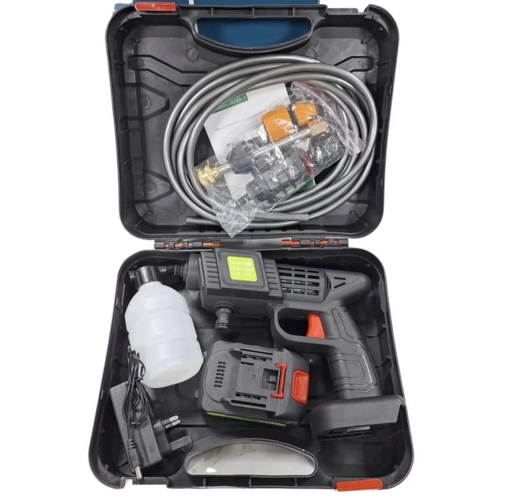 · محتويات المنتج: مضخة الماء - بطارية قابلة للشحن - شاحن للبطارية - زجاجة الصابون - خرطوم الماء - موصل أنابيب المياه - رأسين مختلفتين للغسيل - الفلتر